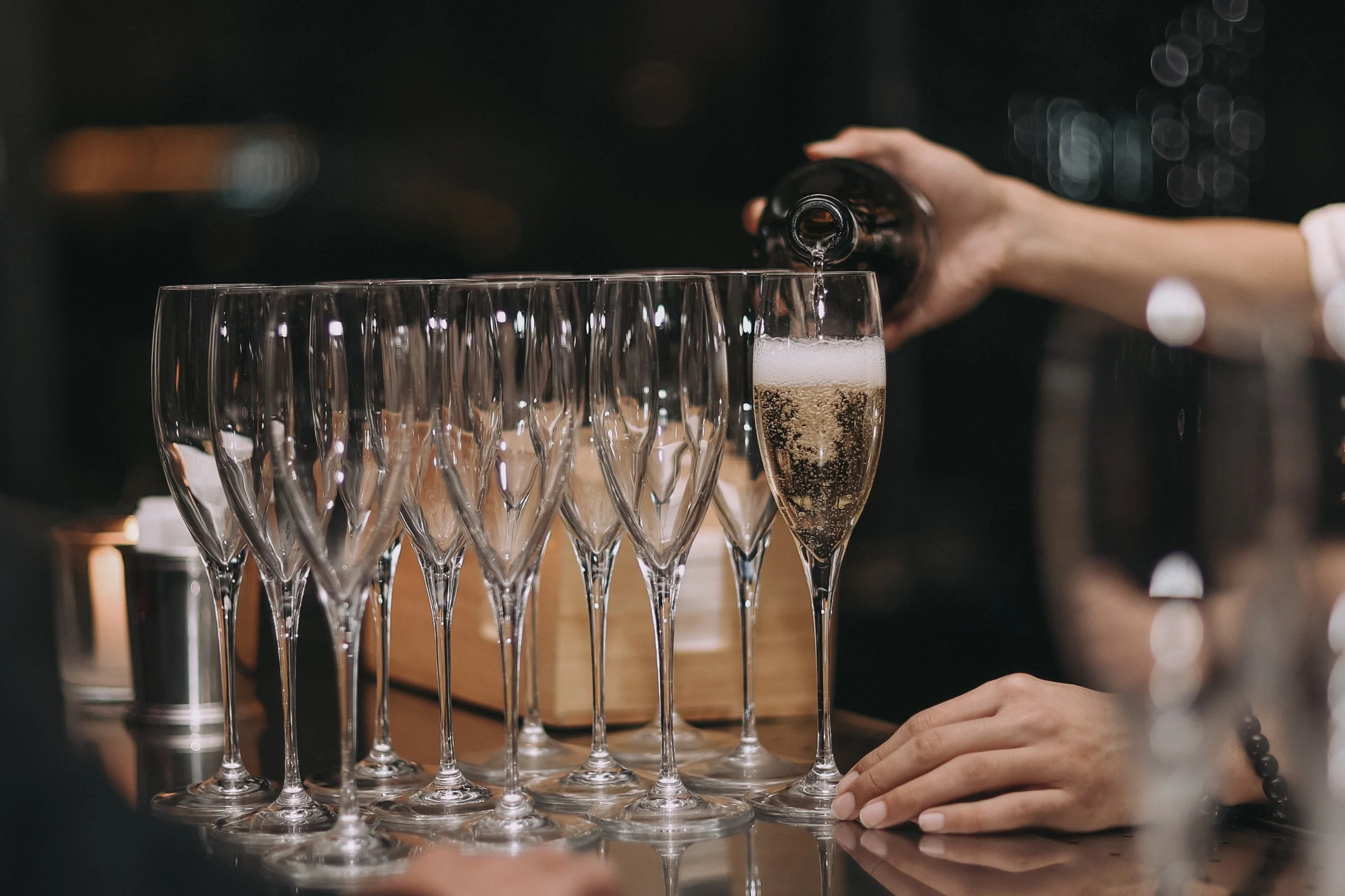 The slow refill of champagne glasses.