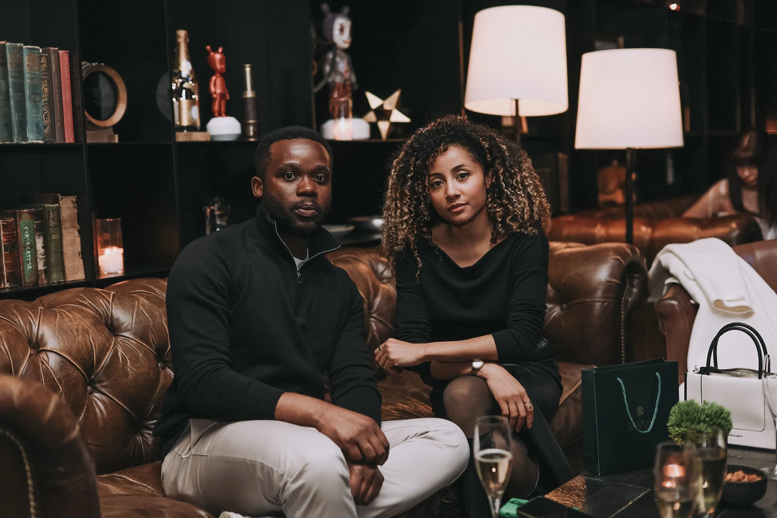 Inside, the room carried the kind of atmosphere that feels deliberately understated. Leather sofas softened by warm lighting. Shelves filled with books and quiet objects. Champagne bottles resting casually among conversation. A space designed less for spectacle and more for the quiet confidence of good company.